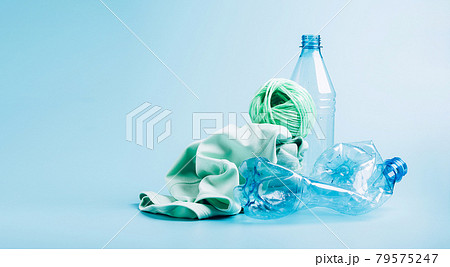 The concept recycling plastic. Empty plastic bottle recycled polyester fiber recycled products against blue background