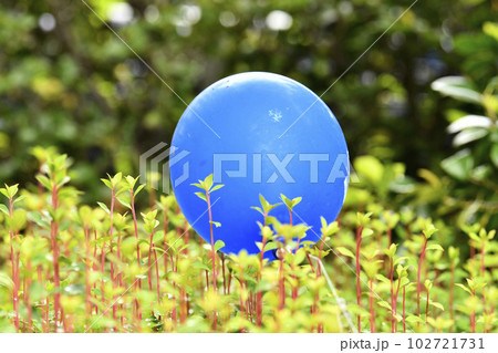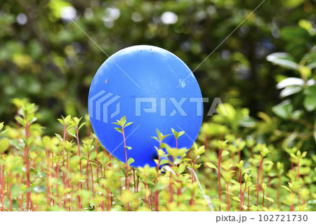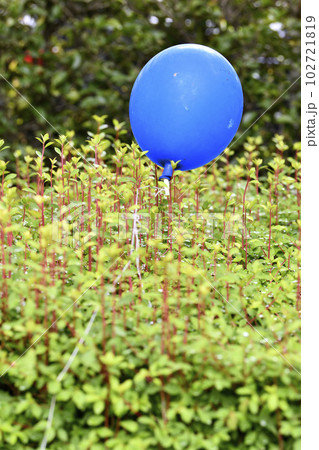 日本の横浜都市景観 青い風船…街中で見かけた風に揺れる青い風船=横浜市内で