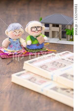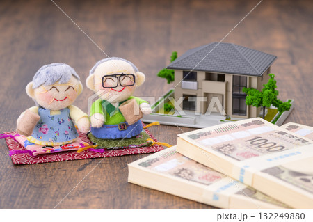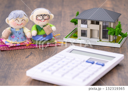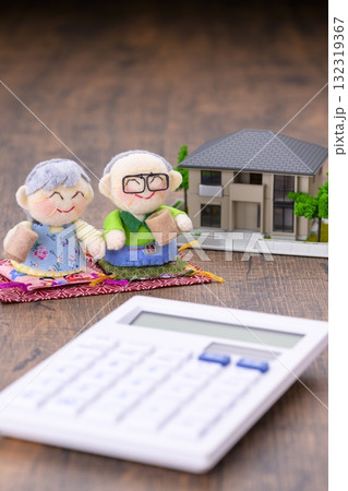 ご年配の夫婦と家のミニチュア(+電卓と札束)