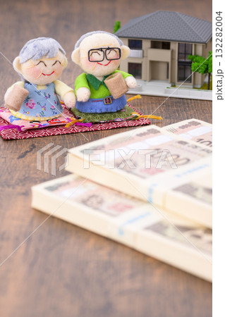 ご年配の夫婦と家のミニチュア(+札束)
