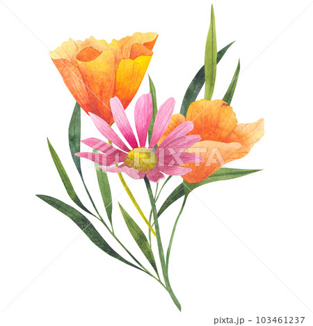 bouquet with orange Watercolor california poppies and cosmos flowers isolated on white background. Hand painted illustration with bright orange flowers to design invitations, postcards and other print