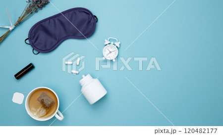 Concept of relaxation and rest, insomnia treatment. Sleep essentials eye mask, tea, pills, clock