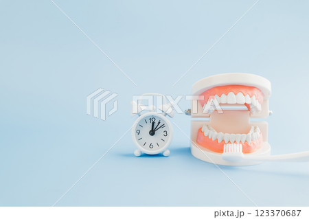 Dentist Day care. A white alarm clock, toothbrush, and tooth model on blue background