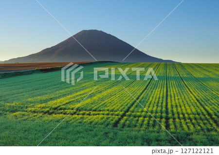 快晴の青空を背景に朝日に光る緑の牧草地と後方羊蹄山の風景 Ver4