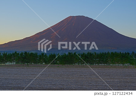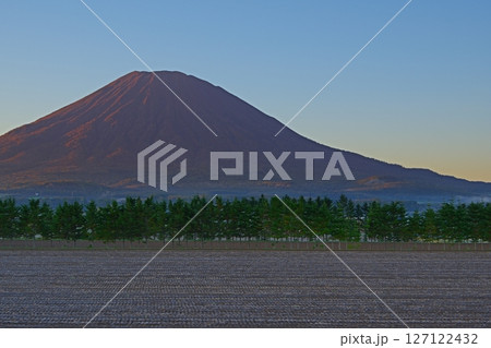 青空を背景に朝日を受けて赤く染まった後方羊蹄山と晩秋の畑風景 Ver1