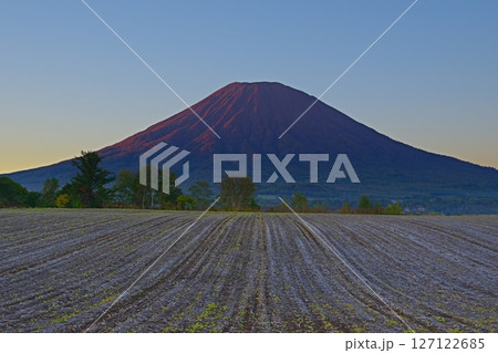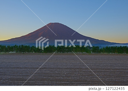 青空を背景に朝日を受けて赤く染まった後方羊蹄山と晩秋の畑風景 Ver3