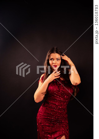 Woman in red dress stands against a red background, expressing beauty during Valentines Day celebration in a studio setting