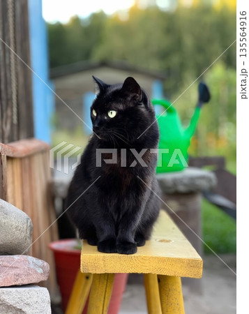 A sleek black cat perches thoughtfully on a yellow bench, its bright green eyes surveying the rustic garden backdrop, blending elegance with curious observation
