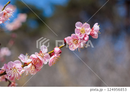 早春の公園に咲く早咲きのカワヅザクラのピンク色の花
