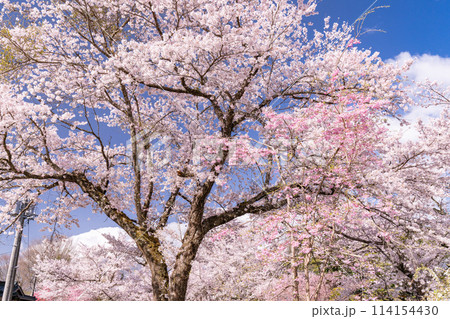 《山梨県》富士山と桜満開の新名庄川・忍野村
