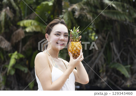 リラックスした夏のバケーション装で美しい22歳の日本人女性のポートレート