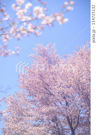春の陽射しを浴びる満開の淡いピンク色のジンダイアケボノ桜