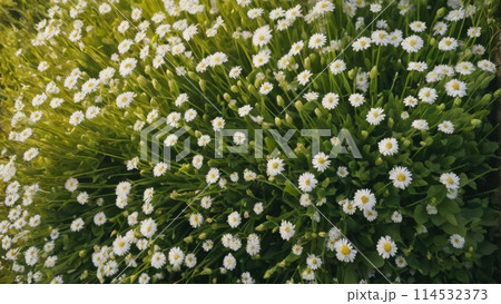 Top view of a variety spring flowers blooming under a tranquil dreamy sun light in a spring morning
