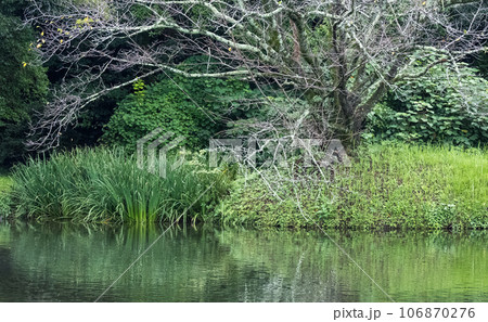 Branches of pine trees on zen pond water with rocky at the Japanese Kyoto Garden landscaping.