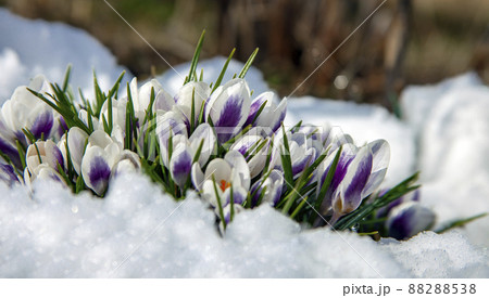 Crocuses blooming beautifully among the thawed trees in the April garden.