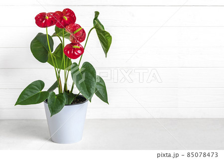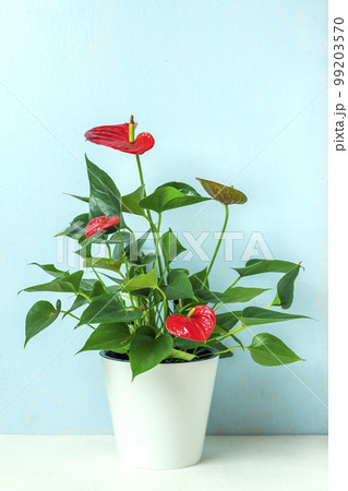House plant Anthurium in white flowerpot isolated on white table and blue background Anthurium is heart - shaped flower Flamingo flowers or Anthurium andraeanum, Araceae or Arum symbolize hospitality.