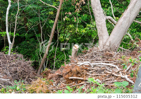 雨で土砂が流れ出してしまい倒れそうな森の木