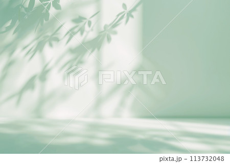 Minimal abstract background, light and shadow of tree leaves. Cosmetic product presentation. Premium podium. Pastel mint green wall, white table. Showcase display case. Front view. Mockup ad. Olive