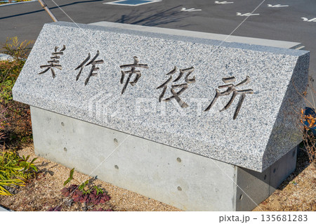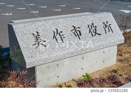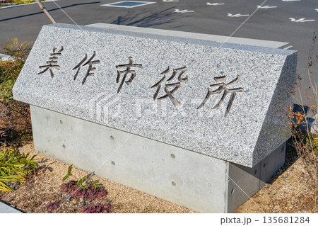 岡山県美作市 新しい美作市役所庁舎と石の銘板