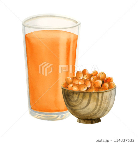 Sea buckthorn orange juice in glass with Hippophae berries in wooden bowlwatercolor illustration isolated on white background. Hand drawn summer herbal drink in rustic style for organic beverage