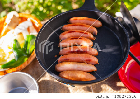 アウトドアで焼くウインナー