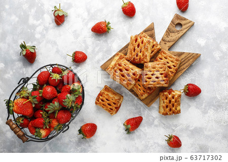 Sweet delicious strawberry cookies with ripe stawberries,top view