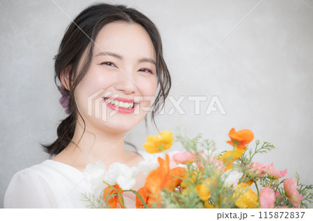 花束を抱えた若い女性の美容やビューティーのポートレート オレンジやピンクのイメージカメラ目線