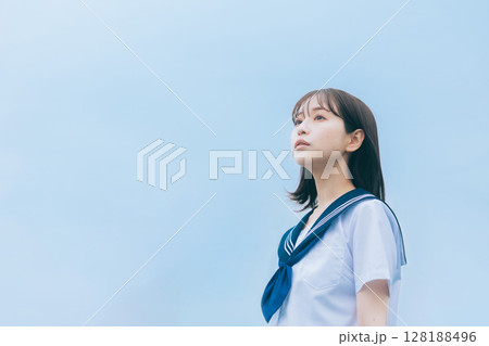 歩いて見上げる女子学生 セーラー服