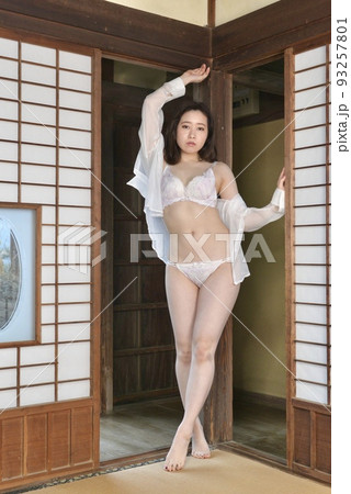 古民家の和室でポーズをとる白いランジェリー姿の若い女性
