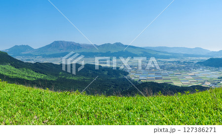 阿蘇山を背景に映える絶景ドライブ美景絶景を求めて草原の中を駆けぬける風景(阿蘇市)