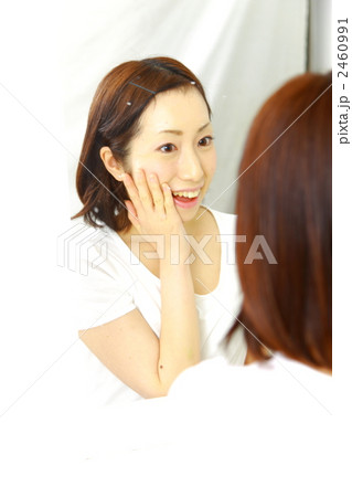 鏡に映った肌を触って微笑むミドル女性