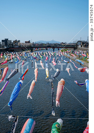 丹沢の大山を望む鈴川の鯉のぼり 五月晴れの空に泳ぐ200匹の鯉のぼり(平塚市)