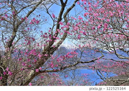 奥日光茶ノ木平展望所(台)付近に咲くアカヤシオツツジの花に中禅寺湖と日光白根山