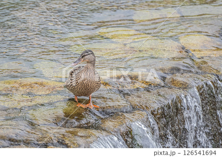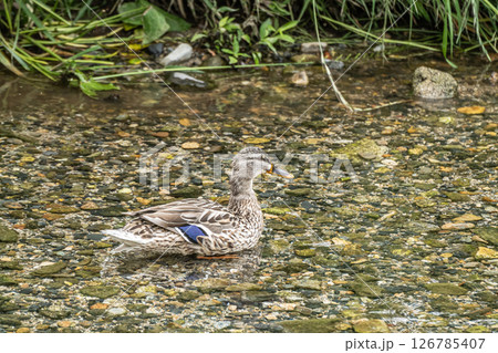 河川敷の緑地でくつろぐマガモ(メス) 京都市鴨川
