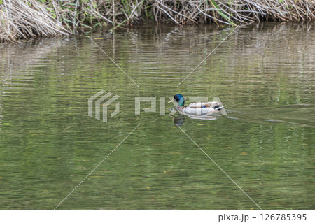 河川敷の緑地でくつろぐマガモ(オス) 京都市鴨川