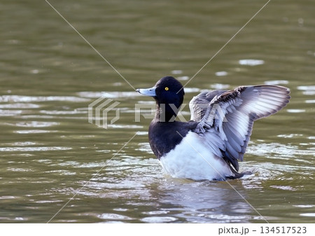 水上で羽ばたくホシハジロ(オス) 琵琶湖疏水 京都市