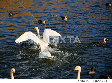 白鳥の越冬地 夕暮れの茨城県菅生沼の優雅で躍動的な白鳥のシルエット 羽ばたき