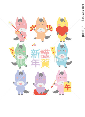 年賀状素材午年の可愛い馬のキャラクター年賀はがきテンプレート(謹賀新年_虹色の馬)