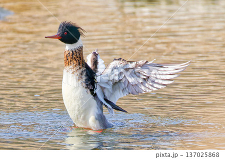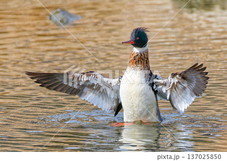羽を広げるウミアイサの雄