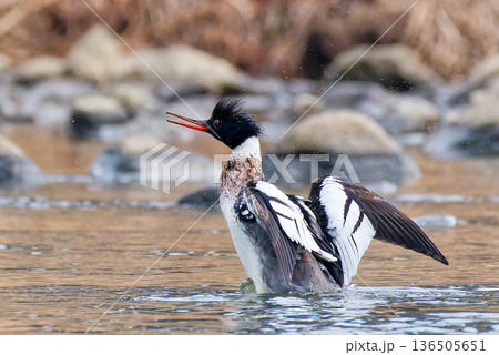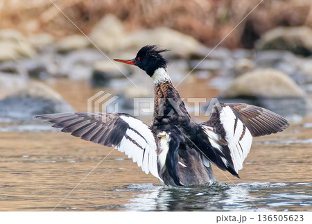 川で開翼するウミアイサ雄