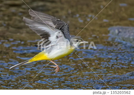 渓流を飛ぶキセキレイ
