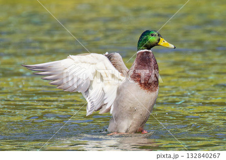 川で羽ばたきをするマガモ雄