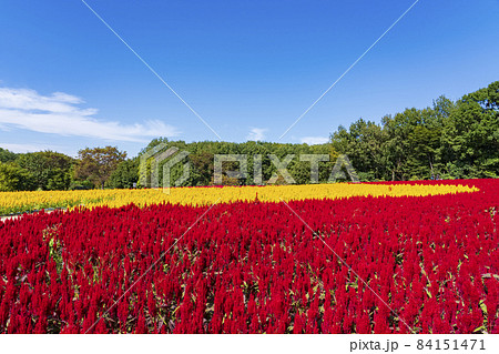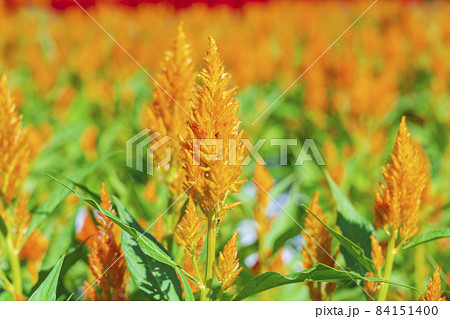 赤と黄色のケイトウ花畑
