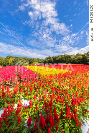 秋空とケイトウの花畑