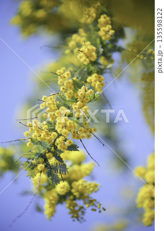 青空に包まれるミモザ ふんわり前ボケの春背景(縦)