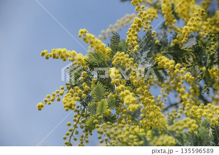 青空に映えるミモザの花 ふわふわ黄色(コピースペース)