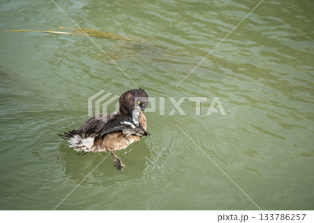 水に浮かびながら身体の手入れをするキンクロハジロ 京都市