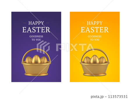 Easter golden basket painted chicken eggs 3d greeting card set design template realistic vector