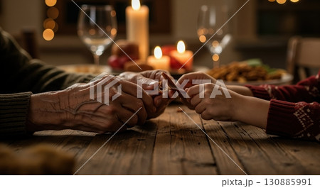 An intimate close-up shows an elderly hand and a child's hand holding a wishbone over a rustic wooden table, illuminated by warm candlelight during a festive gathering.