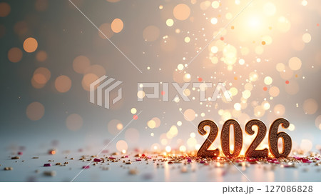Golden 2026 numerals reflecting a bright future on a bokeh light background